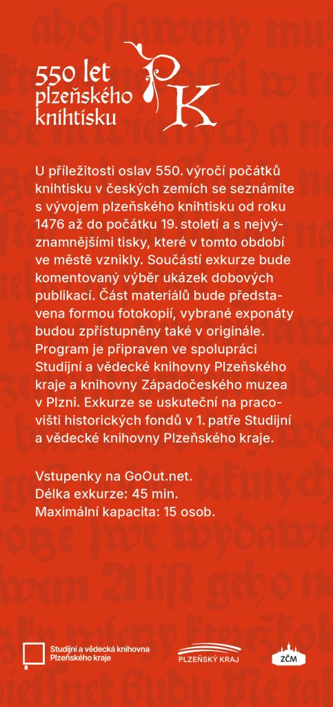 U příležitosti 550. výročí počátků českého knihtisku pořádá Studijní a vědecké knihovny Plzeňského kraje ve spolupráci s knihovnou Západočeského muzea v Plzni odbornou exkurzi. Tématem bude vývoj plzeňské knižní produkce od roku 1476 do počátku 19. století se zaměřením na nejvýznamnější tisky daného období.
