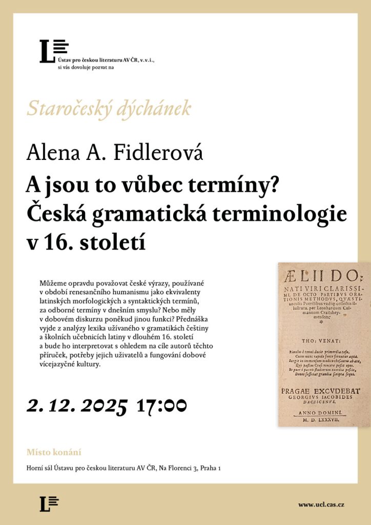 V prosincové přednášce cyklu Staročeský dýchánek pohovoří Alena A. Fidlerová (Filozofická fakulta Univerzity Karlovy) o české gramatické terminologii v 16. století.