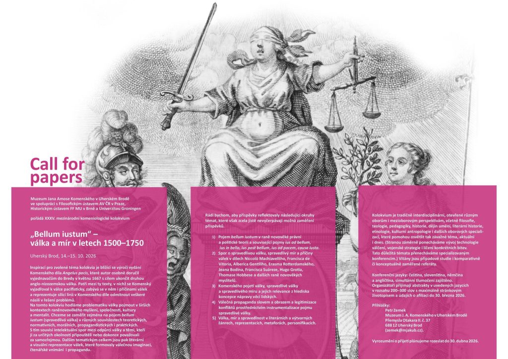 Téma kolokvia je inspirováno blížícím se výročím vydání Komenského spisu Angelus pacis (1667), v němž autor formuloval výrazně pacifistické stanovisko a odmítl násilí jako prostředek řešení konfliktů. Cílem kolokvia je uchopit problematiku války a míru v širších souvislostech raně novověkého myšlení, společnosti a kultury se zvláštním důrazem na pojem bellum iustum (spravedlivá válka).