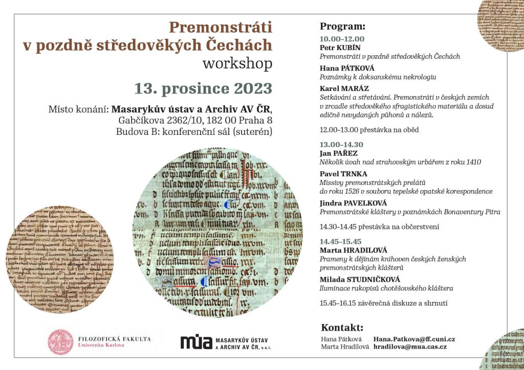 Premonstráti v pozdně středověkých Čechách 7. 12. 2023 | Konference, semináře, workshopy Workshop Premonstráti v pozdně středověkých Čechách se uskuteční 13. prosince 2023 (10-16,15) v konferenčním sálu budově B Masarykovu ústavu a Archivu AV ČR, Gabčíkova 2362/10, Praha 8.